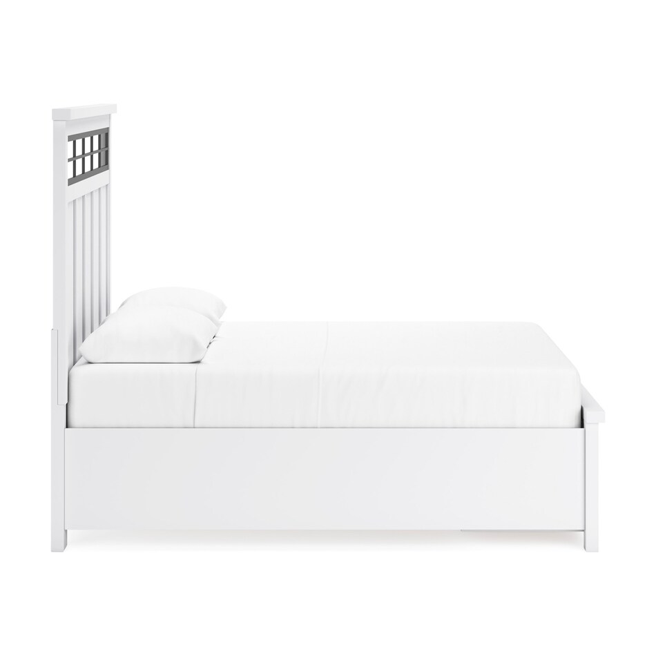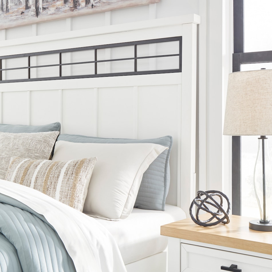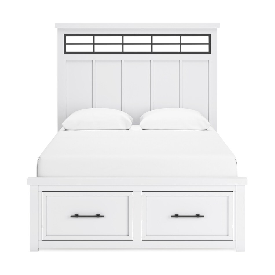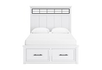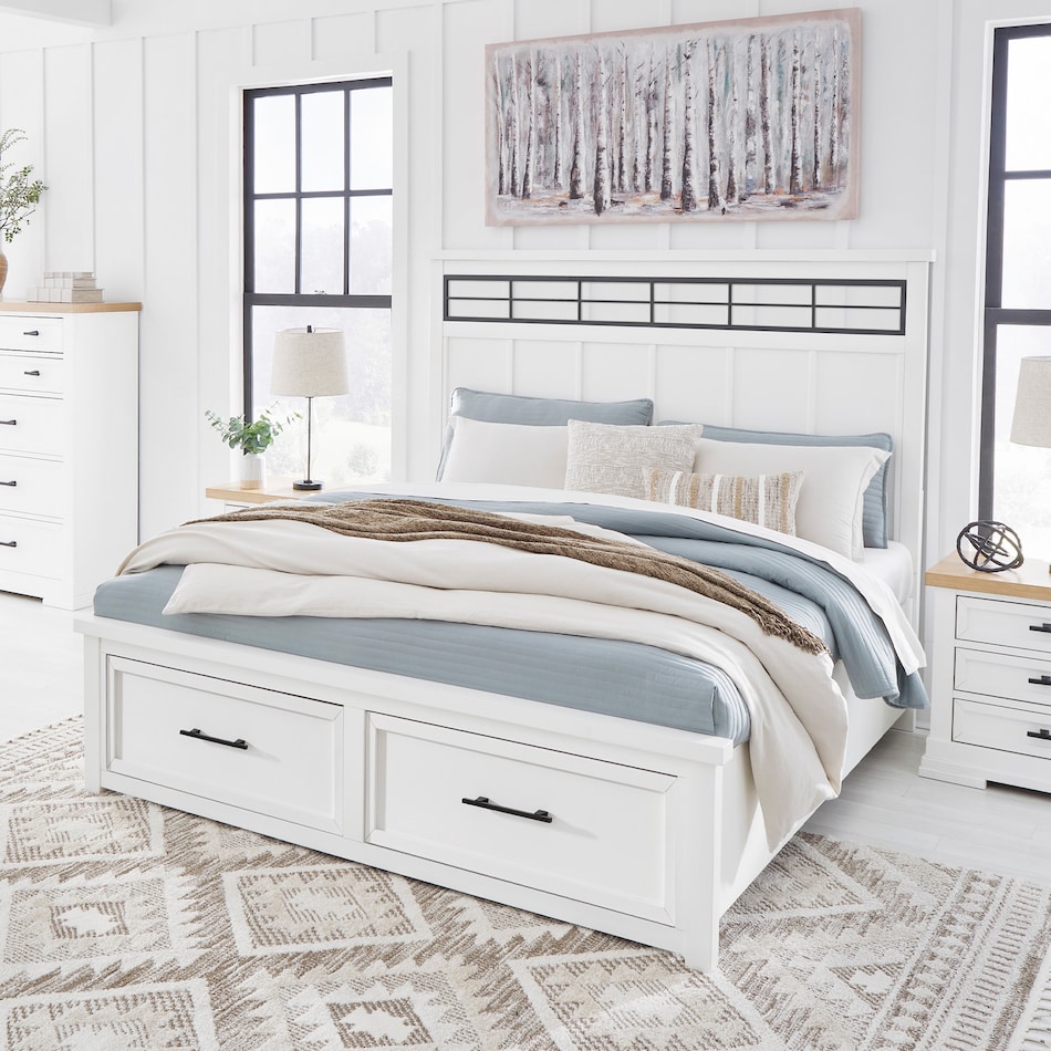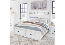 This king panel storage bed delivers casual style with substance. An inset metal detail on the headboard displays a unique take on modern farmhouse design. The bed's sturdy silhouette, classic white finish and black pulls exude a comfortably cozy vibe in your soothing sanctuary. Storage drawers are spacious enough for all your essentials.