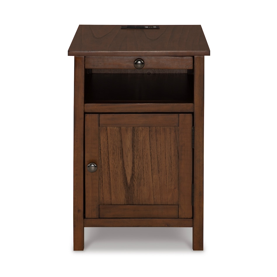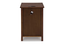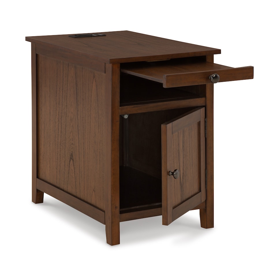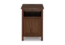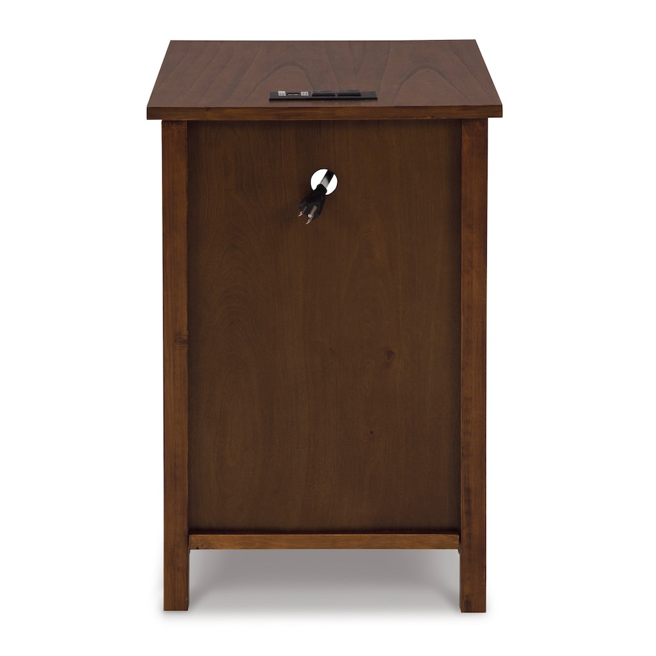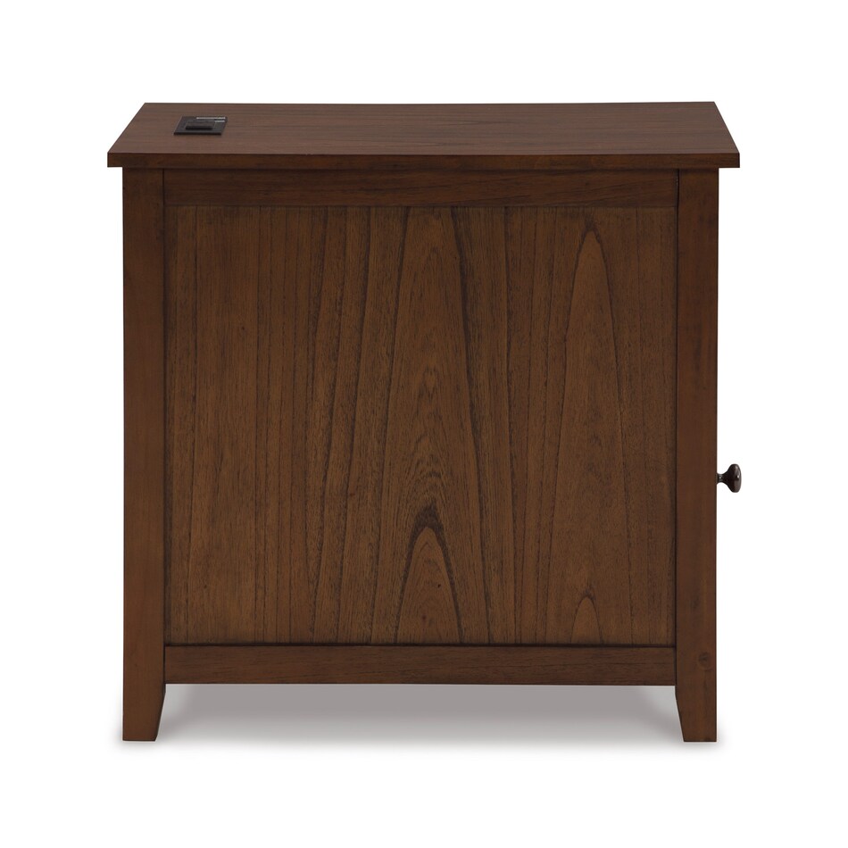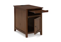 Add big character to a small space with this chairside end table. With its compact size and strong silhouette, it can go anywhere and blend easily into the decor. Less is so much more with the Shaker-inspired design and warm brown wood tone finish. Loaded with form and function, this end table displays accent pieces and stores essentials securely while keeping devices powered up.