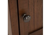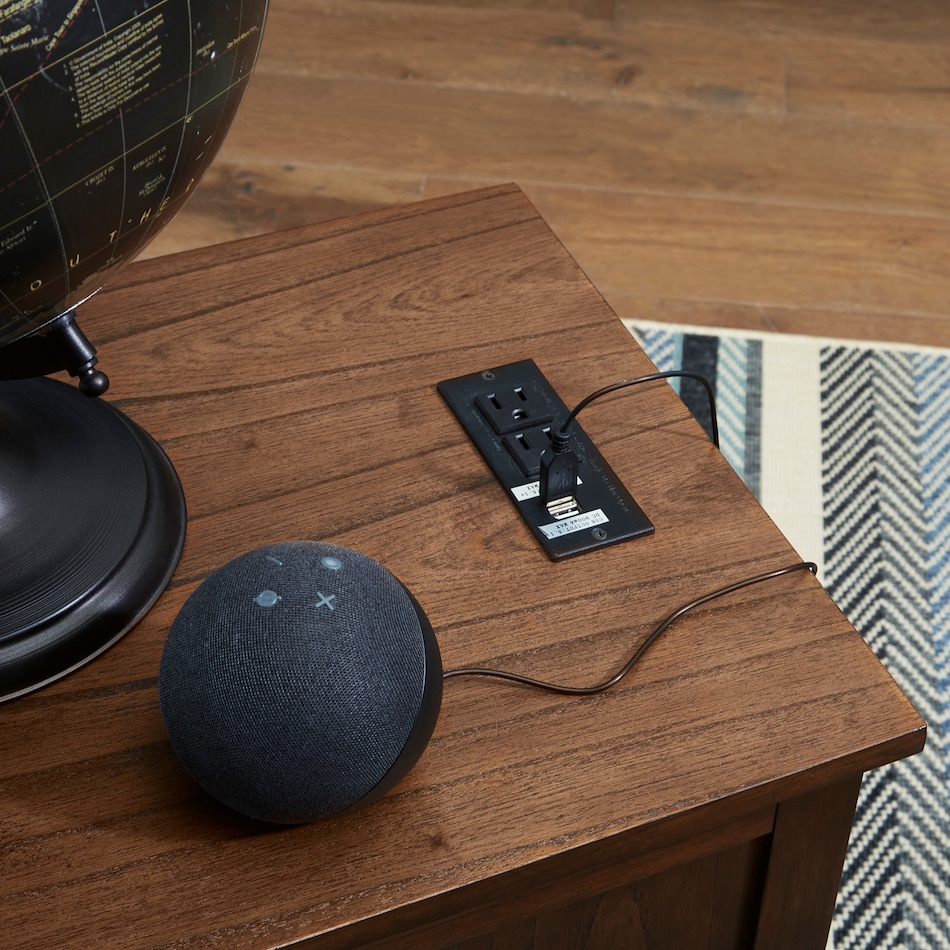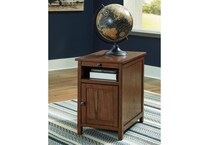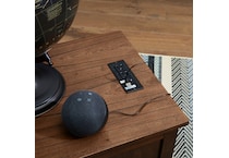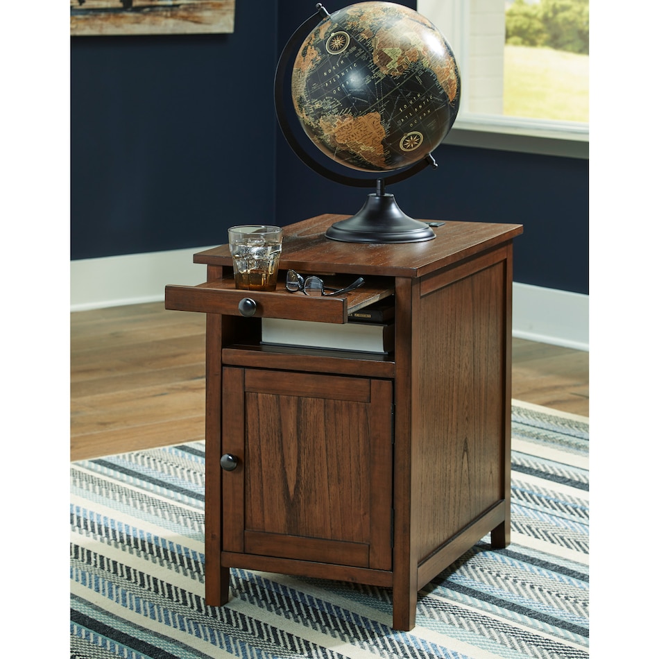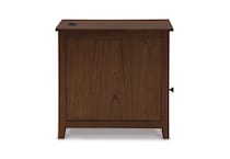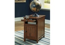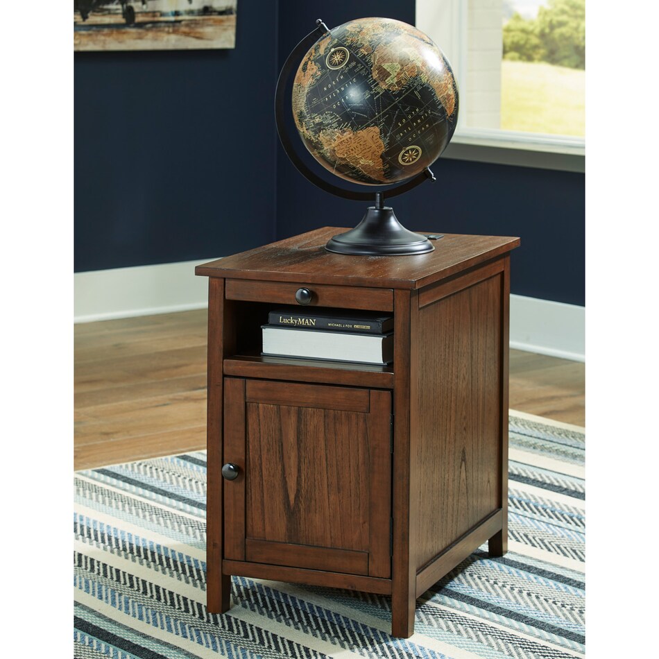 Add big character to a small space with this chairside end table. With its compact size and strong silhouette, it can go anywhere and blend easily into the decor. Less is so much more with the Shaker-inspired design and warm brown wood tone finish. Loaded with form and function, this end table displays accent pieces and stores essentials securely while keeping devices powered up.