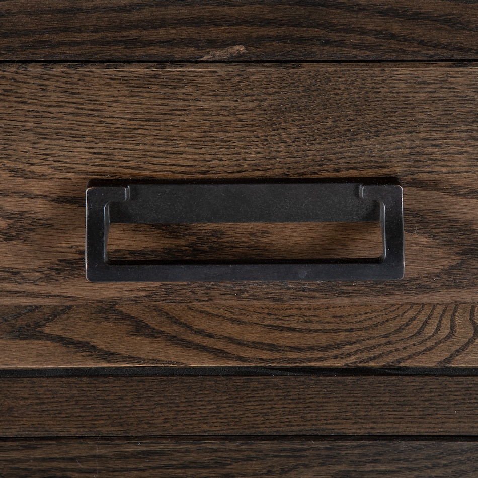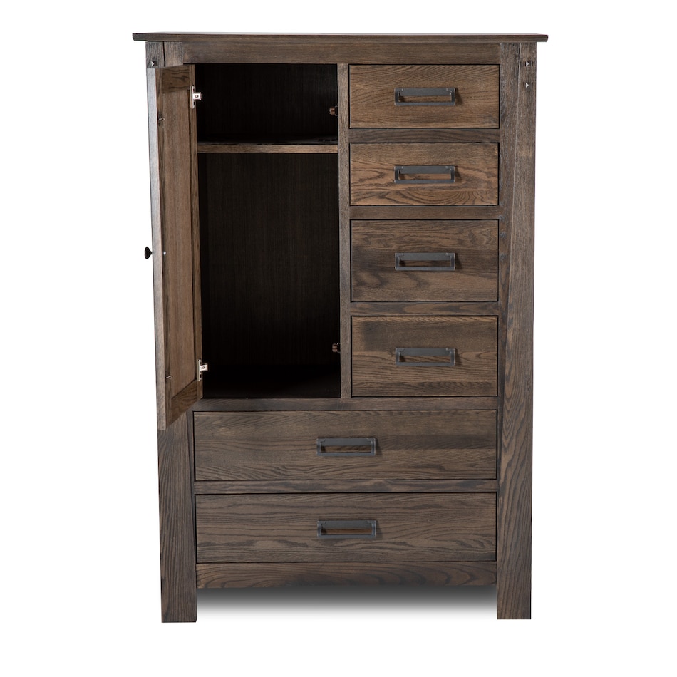 The Kennan Door Chest is made in Wisconsin from solid wood with a stained finish. Two large and four small drawers, plus an additional door with an upper shelf provides plenty of storage. Custom order with other wood / stain and hardware options.