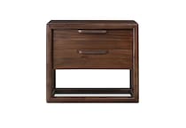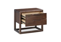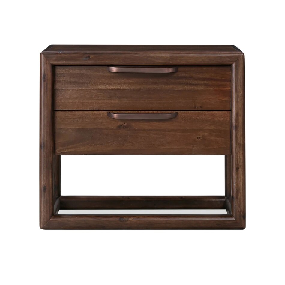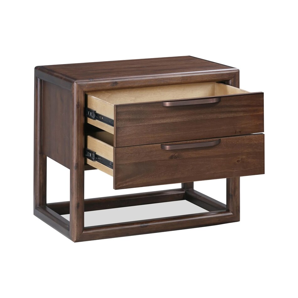 The Hycrest 2-drawer nightstand is a soft, open and airy take on modern design with its frame-style bases, lifted cabinets and bullnose edges. Made from Acacia solid wood and Acacia wood veneer, the transparent rich brown stain showcases naturally occurring colors and grain figures. The low sheen lacquer and open pores in the wood grain create inviting, tactile surfaces that are both natural and refined.