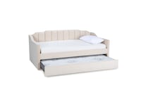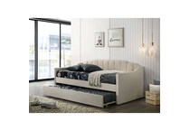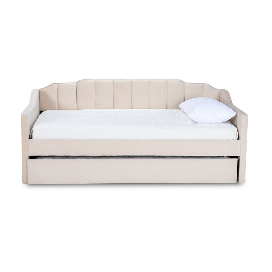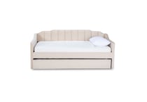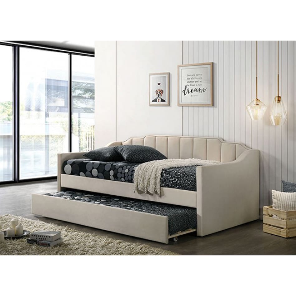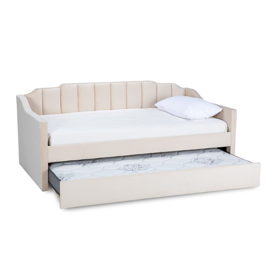 Staircase headboard design and sleek vertical channel tufting come together in this classy contemporary daybed. Rest your arms on the sloped track armrests as you lounge with friends in the morning. Then pull out the bottom trundle for extra sleeping space when it's time to go to bed. Fully upholstered in fabric, it's the kind of space-saving furniture that will take your space up a notch.
