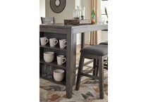 Striking a simply chic pose, the Philip Counter Height Table serves up high style on a smaller scale. Its antiqued gray wash finish gives the clean-lined design a casually cool sensibility. Side shelves cleverly balance form and function.