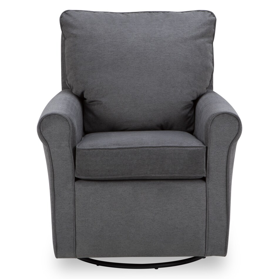 We love the classic, clean look of our Elnora Swivel Glider. Featuring a cool gray color, a square back, and completely comfortable seating, bringing Elnora into your home is a win-win. Customize Elnora with hundreds of fabrics to choose from!