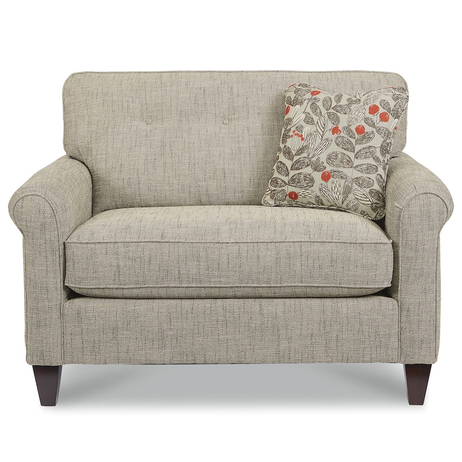 Our Julie Chair-And-A-Half from La-Z-Boy® has an understated look that complements your laid-back lifestyle. Simple elements like petite rolled arms, welt trim, decorative wood legs and button detail on the back make this roomy piece a welcome addition to any living room, den or nursery. The patented ComfortCore® cushion provides optimum support for a long or short sit. Make it yours with your choice of fabrics and available upgrades. Includes one 18” accent pillow.