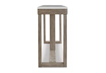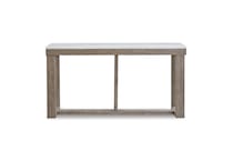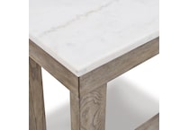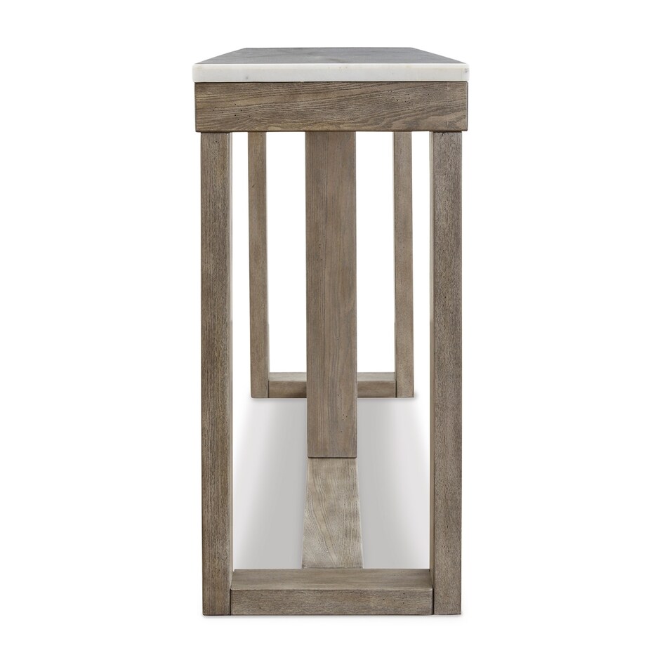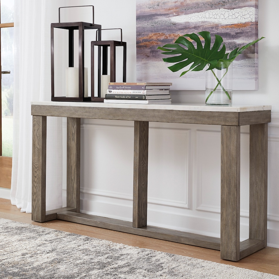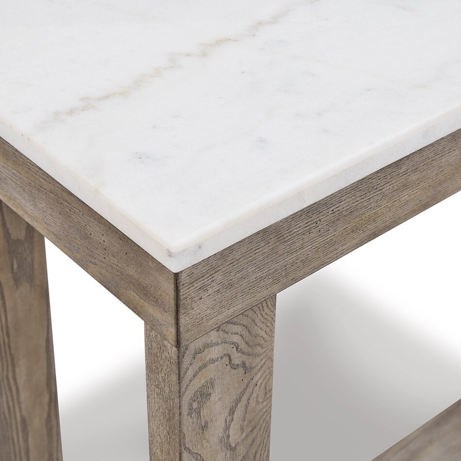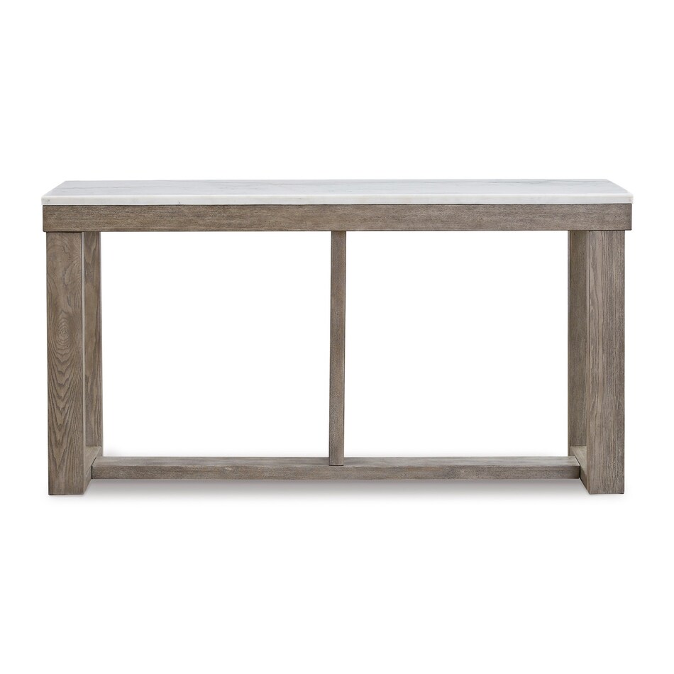 This sofa table is simple in design but big on style. Finished with a trend-right grayish brown wood tone, its bold, blocky profile and natural marble top are timeless classic choices that is ideal for pairing with an ottoman underneath to pull extra seating into the room or remaining clean and sleek on its own. Adding to its beauty, the marble top's color variations, fissures, mineral deposits and veining are naturally formed and are not defects.