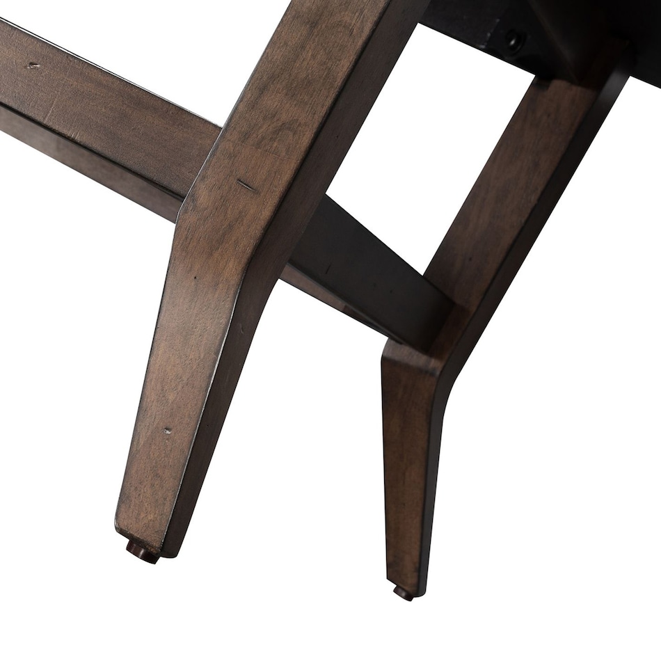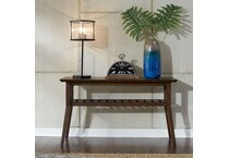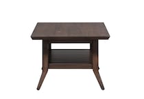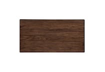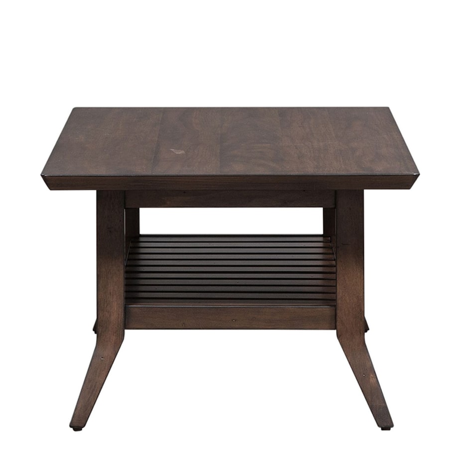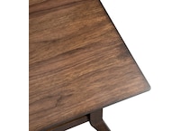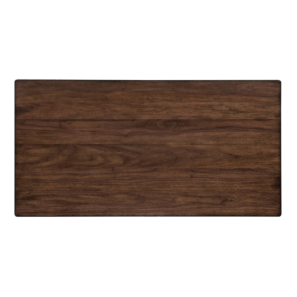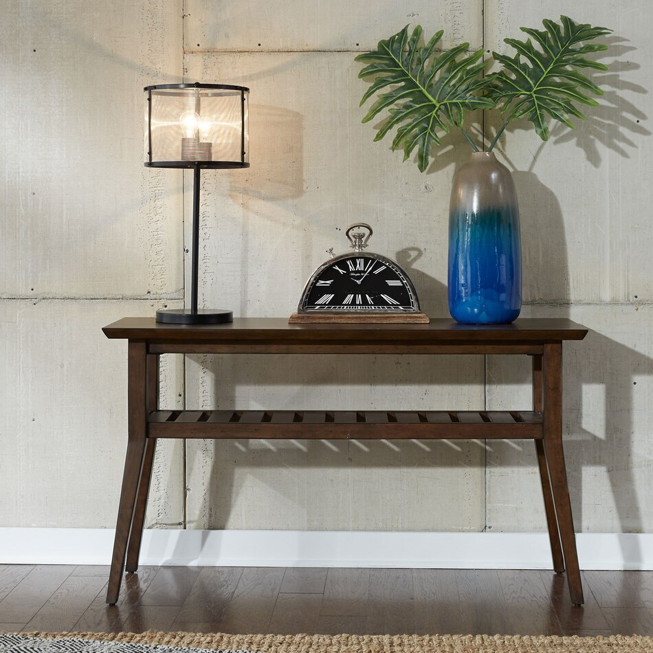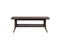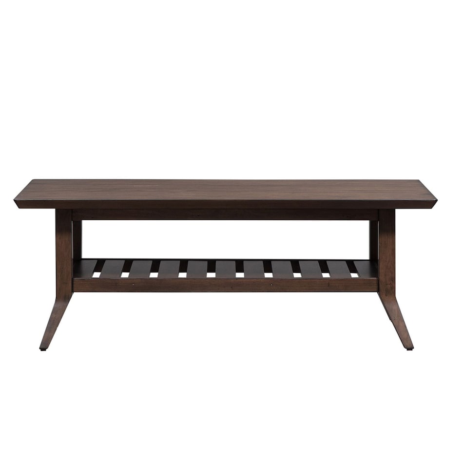 Accent your space with the modern Theresa rectangular cocktail table. Crafted of rubberwood solids and cathedral walnut veneers, this piece features a bronze spice finish, bottom slat shelf for additional storage, and is anchored by splayed tapered legs. This simple yet sophisticated cocktail table would make wonderful addition to your contemporary styled home.