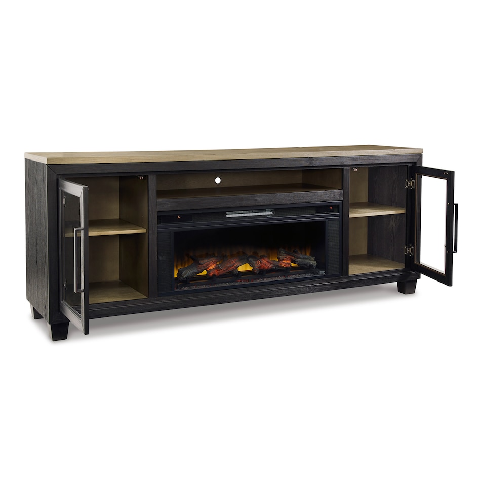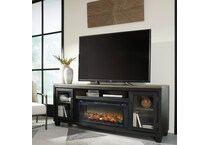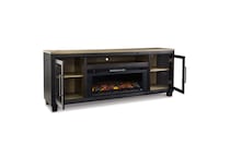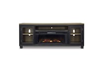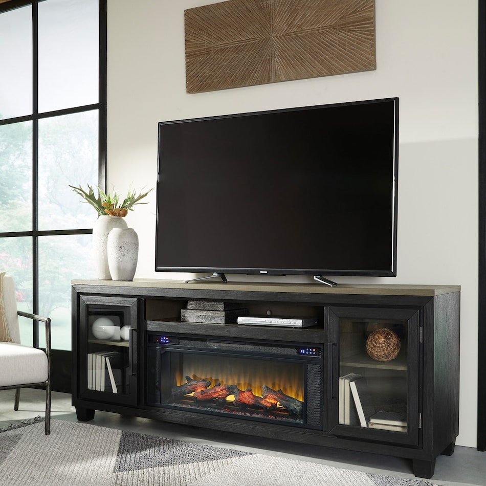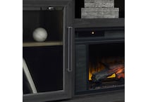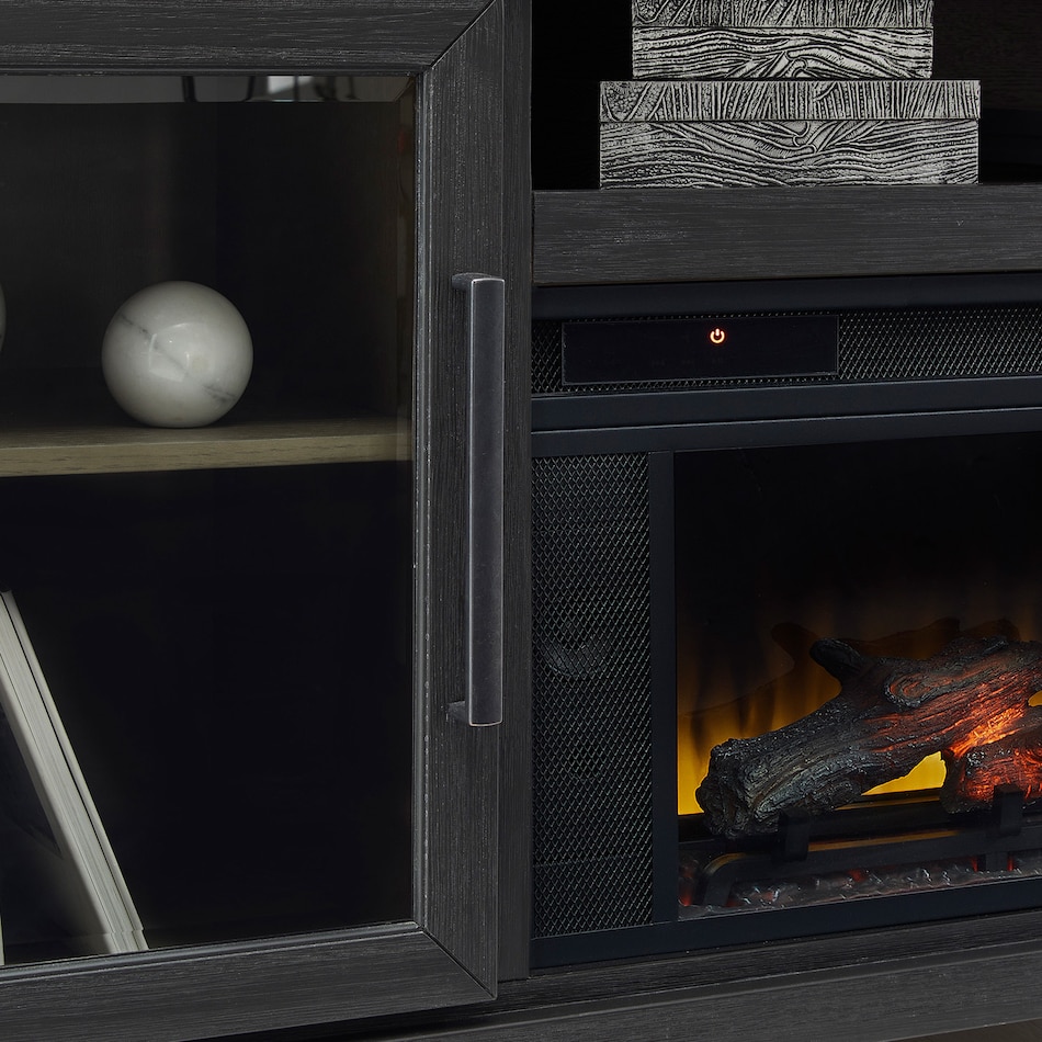 This TV stand with fireplace is rustic, casual contemporary style simply done right. Its two-tone color scheme features a rich brushed black finish accented with a dusty grayish brown wood tone. With two glass-front cabinets (each with an adjustable shelf), an open cubby and a removable center shelf, it offers plenty of storage to house all of your electronic needs.