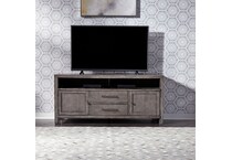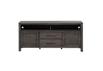 Accent your living room with the perfect farmhouse design, using this unique and stylish 66" tv console. Crafted of poplar solids with knotty white oak veneers, this piece accommodates most 72" TVs and features sound bar storage, planked tops, adjustable shelving, block pilasters, full extension drawer glides for easy access to storage, and is accented by washed brass elongated bar pull hardware with rounded ends. This console is also available in a flea market white finish, sure to find a place in any home. Wire management provisions accommodate electronics or gaming equipment. The all-over Dusty Charcoal finish accompanied by heavy distressing sets this piece apart from the rest of the collections.