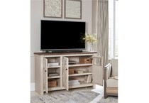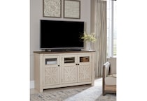 Whether your style is farmhouse fresh, shabby chic or country cottage, you'll find this large TV stand perfectly in tune. Its two-tone finish pairs a trendy textured antique white with a weathered gray for that much more quaint character. Charming elements include crossbuck adorned cabinet doors with glass inlays for peek-through flair. Ample adjustable shelving and cutouts for wire management nicely accommodate your media needs.