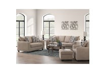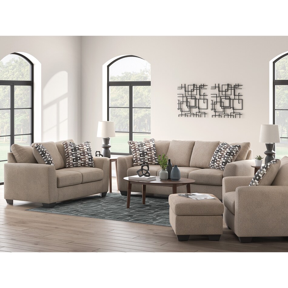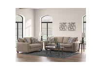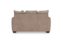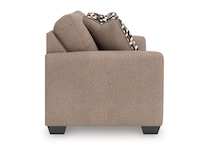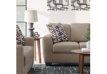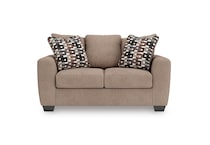 Transitional and right on trend. This loveseat's upholstery is a delightful change from the ordinary, with hints of soft brown giving the gray hue added depth. It’s punctuated with chic accent pillows in an eye-catching, stylized stripe design. Whether you're hosting friends and family or relaxing solo, this loveseat invites homey, comfortable character into your space.