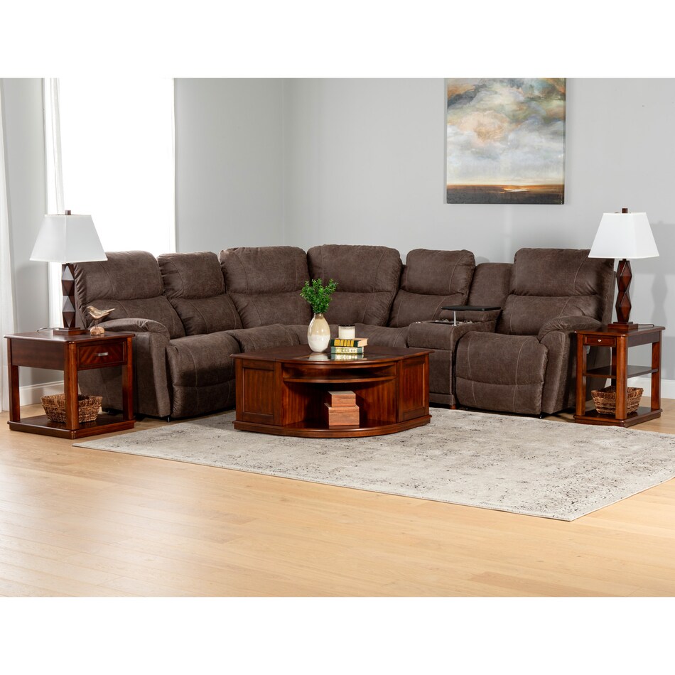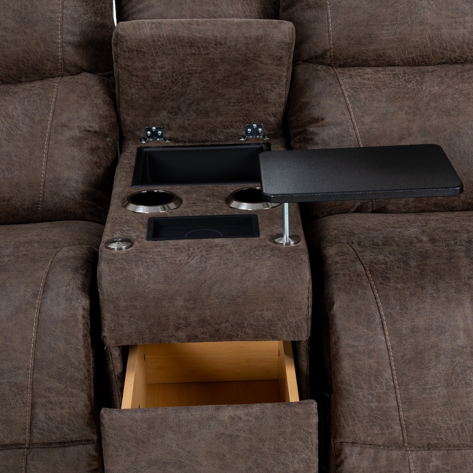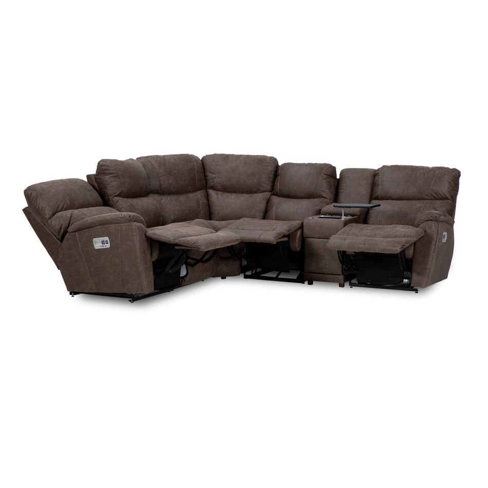 Turn casual evenings into cozy family nights with our Trouper sectional. Sink into one of the sculpted bucket seats and let the split back cushions provide soft support for your head, neck and lumbar region. Adjust the back and chaise legrest for personalized reclining comfort, or lean back without raising your feet. Perfect for movie nights and more, this sectional has plenty of comfort to go around. The upgraded power console bundle includes a wireless charging tray, two electrical outlets, and two USB ports on the inside. Flip-top storage also features two table ports and a removable table. Inset arm pads and elegant top-stitching make Trouper easy on the eyes, too. Customize yours with a wide array of fabrics, pieces and available upgrades.