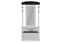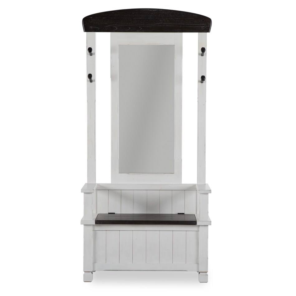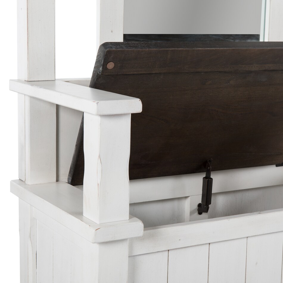 Our Bay Hall Tree will make a wonderful statement in your entryway or mudroom thanks to its two-tone finish, rustic charm, and supreme functionality. Constructed from mahogany and mindi solids and veneers, Bay features a seat with hidden storage, railroad spike hangers, and beautiful European Cottage finish.