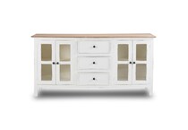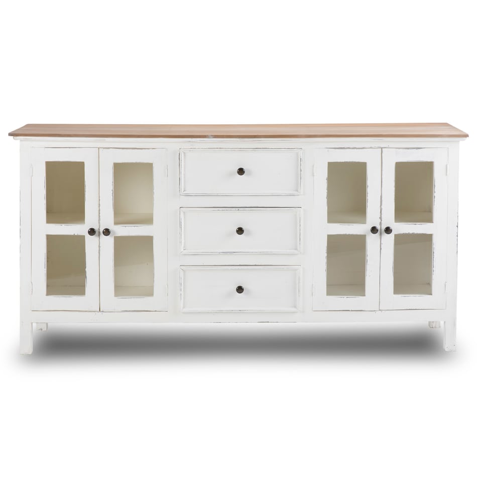 The Liz Sideboard is skillfully handcrafted with reclaimed lumber and materials for a beautifully distressed look. Four glazed doors and three drawers with roller glides.