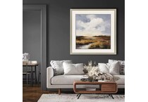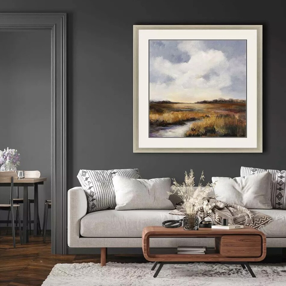 • A marsh landscape in autumn is matted in white. Framed in a modern antique silver leaf wood with champagne gold wash and painted black edge.