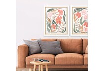• This single folk floral abstract print is framed to size under glass with an inner natural wood tone frame and outer white matte frame.