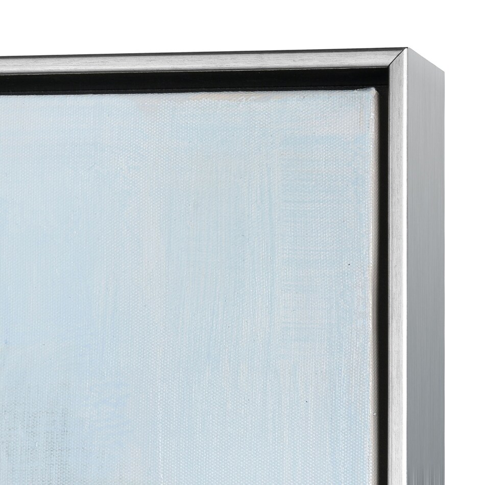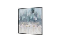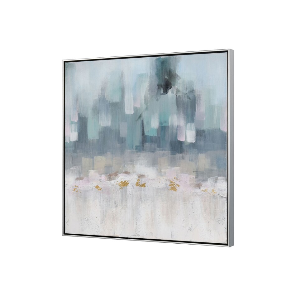 Remembrance brings an impressionist style to any room setting. Using subtle blues, grays and whites to create an intriguing abstract landscape, this piece is the perfect pop of subtle color. Hand painted on canvas, this piece of art features a floating silver frame.