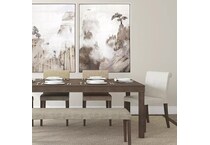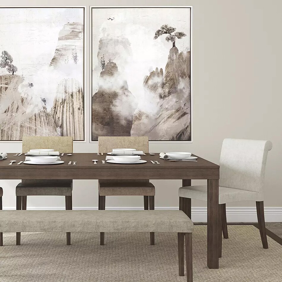• A mountainous landscapes fades in and out of sight. Canvas is mounted in a whitewash wood floater frame.