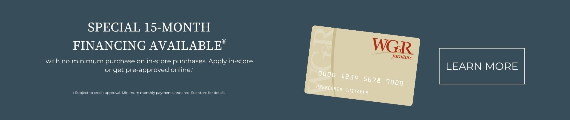 ¥On purchases with your WG&R Furniture credit card made between March 20-24, 2026. Interest will be charged to your account from the purchase date if the promotional purchase is not paid in full within 15 months. Minimum monthly payments required. No minimum purchase required.